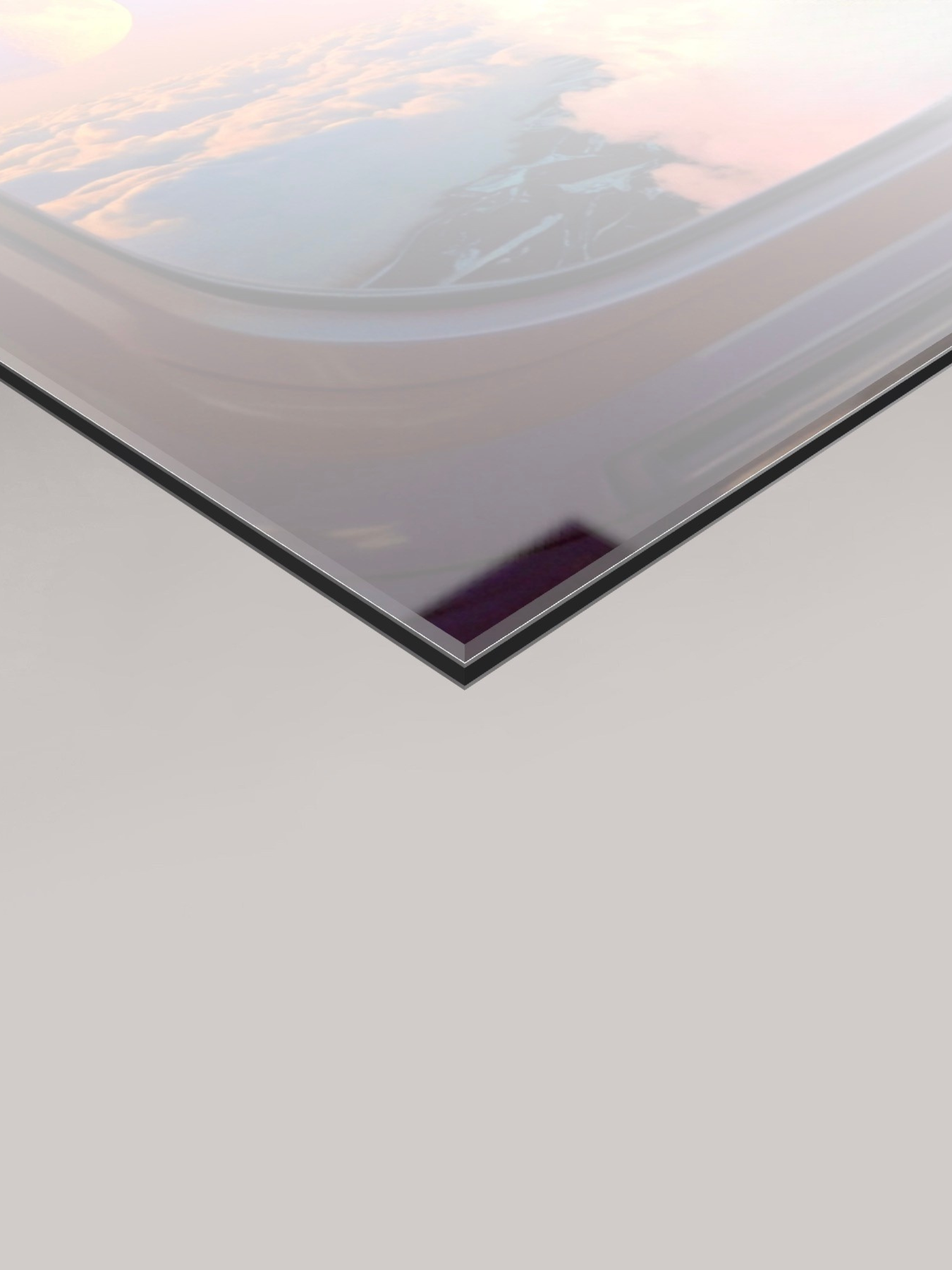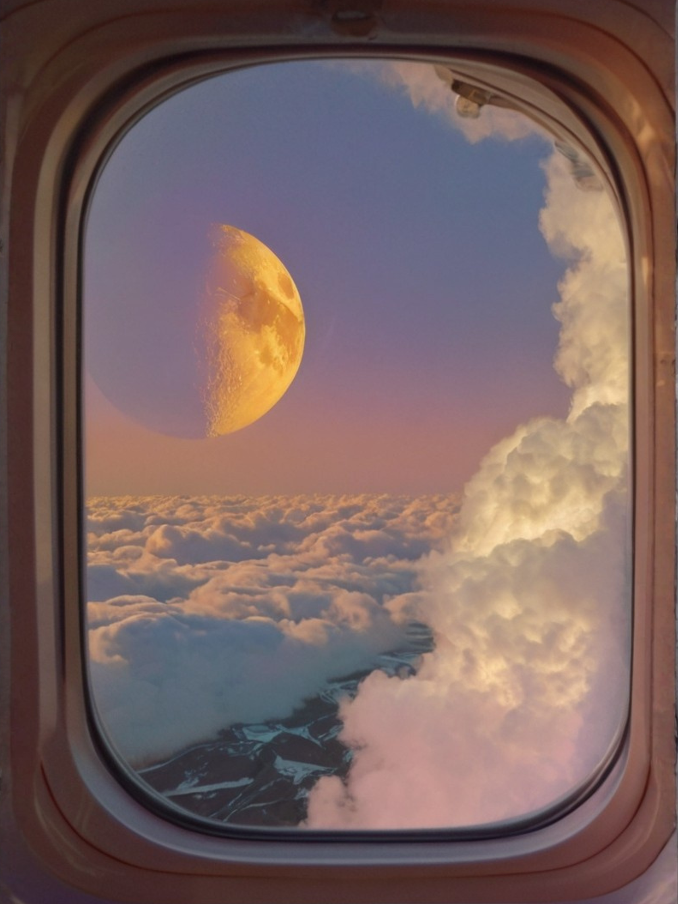 “Lunar Window” zeigt einen goldenen Halbmond über einem Meer aus Wolken — ein stiller, traumhafter Blick aus dem Flugzeugfenster, der Ruhe, Weite und Staunen in jeden Raum bringt.
